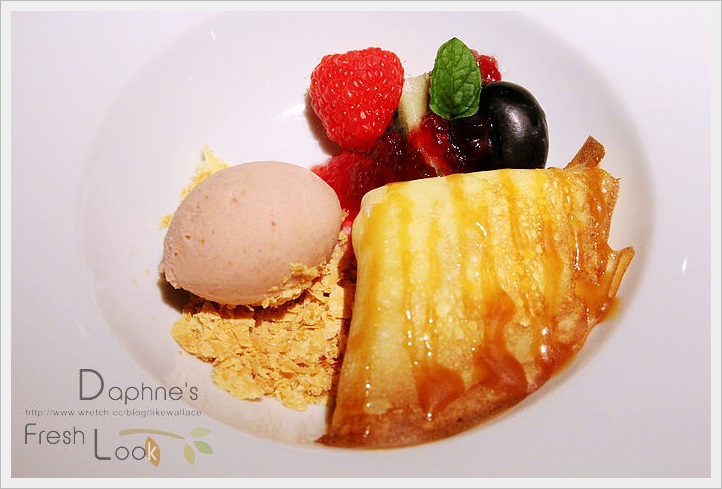 法式香橙煎餅因為切片拍得不好看就不放了,搭配杜瓦黑櫻桃酒醬及草莓冰淇淋,煎餅內夾有滑口不黏膩的卡士達醬與香橙果肉,餅皮薄軟柔氣,蘊涵奶香,與料堆疊一起吃,擺設的莓果及草莓冰淇淋讓整體吃起來是一道爽口且熱量負擔不會太大的甜點。