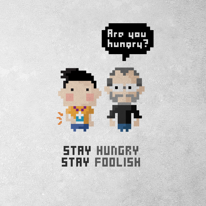 在後賈伯斯時代,我拿著 iPhone 時還是會想起他在史丹佛大學畢業典禮的演講中,勉勵學子的一句話:「Stay Hungry, Stay Foolish」。這次藉由 Pixel Art 的設計方式,同時也向狂人賈伯斯致敬,隨時勉勵自己不要怠惰,為自己的目標加油!