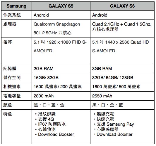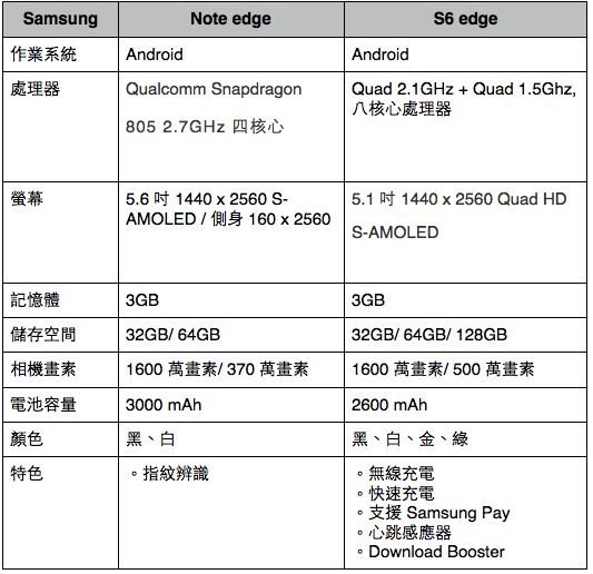 首先整理S6、S6 Edge規格,並與S5 與 Note Edge比較。在規格方面 S6 與 S6 edge 皆使用了 Quad 2.1GHz + Quad 1.5Ghz, 八核心處理器、3GB RAM 以及有著 32GB/ 64GB/ 128GB 三種容量提供選擇。相機則是有著 1600 萬畫素與 500 萬畫素前置鏡頭,電池容量分別為 S6 2550 mAh 與 S6 edge 2600 mAh。