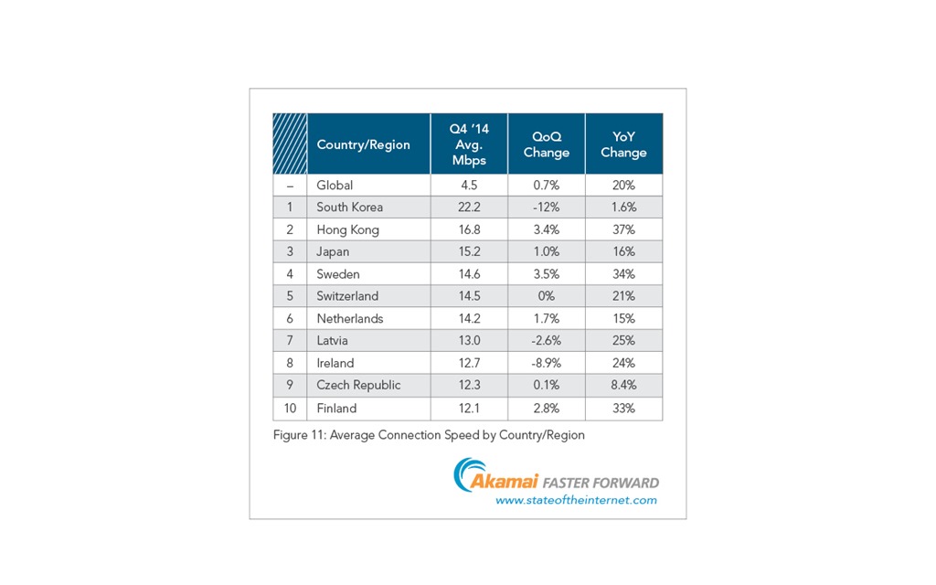 全球平均連線速度連續第三個季度超過 4 Mbps 的「寬頻」門檻,然 2014 年第四季微幅上升 0.7% 至 4.5 Mbps。全球平均連線速度的季度變化在前 10 個國家或地區中各不相同,其中有 6 個國家的平均連線速度呈現增長,3 個呈現下跌,而瑞士則維持不變 (14.5 Mbps)。在這些平均連線速度呈現季度增長的國家或地區中,增幅最高的是瑞典 (14.6 Mbps),有不錯的 3.5% 增幅。以全球來看,共有 98 個符合資格的國家或地區於第四季的平均連線速度呈現增長,增幅最高的是尼泊爾的 78% (2.5 Mbps),增幅最低的是只有 0.1% 的捷克共和國 (12.3 Mbps)。平均連線速度全球年度上升 20%,於 132 個符合資格的國家或地區中呈現增長,增幅由摩洛哥的 0.3% (2.4 Mbps) 到剛果的 146% (1.3 Mbps)。