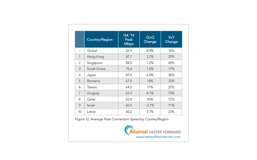 與平均連線速度相似,2014年第四季全球平均高峰連線速度亦呈現微幅上升,升幅為 8.4% 至 26.9 Mbps。香港以 87.7 Mbps 再次蟬聯平均高峰連線速度最快的地區,不過前 10 個國家或地區的平均高峰連線速度皆超過 60 Mbps。以全球而言,在 142 個符合資格的國家或地區中,有 114 個平均高峰連線速度與第三季相較呈現增長,增幅由斯洛維尼亞的 0.1% (39.3 Mbps) 到剛果的 90% (10 Mbps)。與 2013 年第四季相較,共計106 個符合資格的國家或地區的平均高峰連線速度皆呈現增長。