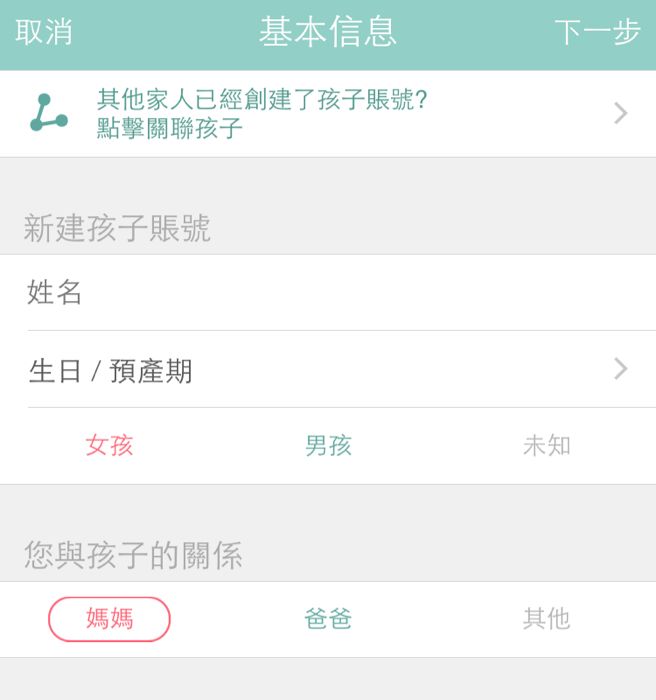 而一開始進入”時光小屋” 要先為寶貝建立基本資料,包括暱稱、生日、性別、以及你們之間的關係。