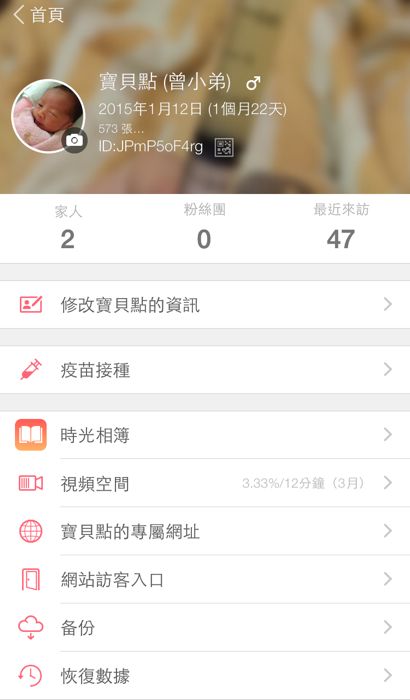 除了上傳製作回憶以外,直接點選最上方寶貝的封頭還可以看到寶貝的首頁資訊,分別有修改資料、疫苗接種提醒、時光相簿製作、專屬網址建立… 等等。