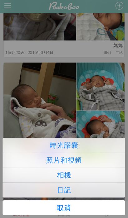 透過右上方的 “+” 便能進行為寶貝製作時光膠囊、上傳照片影片、拍照或是寫日記等動作。