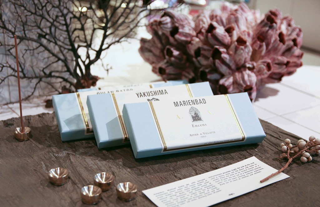 Astier de Villatte系列線香即日起於好氏研究室(註)開始販售,共計推出Aoyama (青山)、DELHI (德里)、MARIENBAD (馬倫巴)、NAMCHE BAZAR (納姆澤扎爾)、OULAN BATOR (烏蘭巴托)、OPERA (歌劇院)、QUEBEC (魁北克)、STOCKHOLM (斯德哥爾摩)和YAKUSHIMA (屋久島)九種薰香香氛(表)。新品上市期間,凡購買任一盒Astier de Villatte線香即贈送價值NTD 258元經典黃銅線香座乙只,數量有限送完為止。