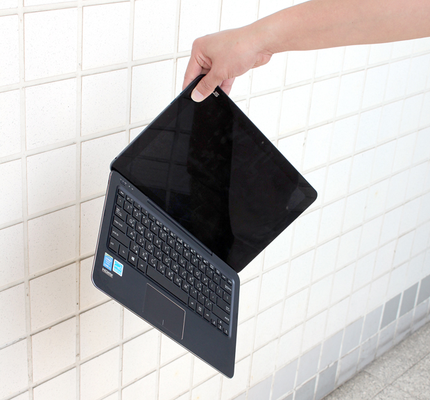 平板和鍵盤基座的分離設計,主要是採用拆裝方便的磁吸設計,真的吸得很緊,拿著上面這樣甩也不會掉(當然請勿模仿啦!整台掉下去不是開玩笑的~)