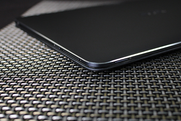 當然先直接拿出來用啊!我最喜歡的就是 Transformer Book T300 Chi 這個帶有點手機設計 FU 的鑽石切割邊緣設計,跟黑色霧面的質感有沉穩的對比,很有設計感。