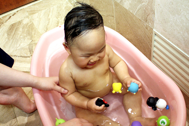 只是洗的過程中爸媽要多擔待些,小寶寶有時很會玩水…