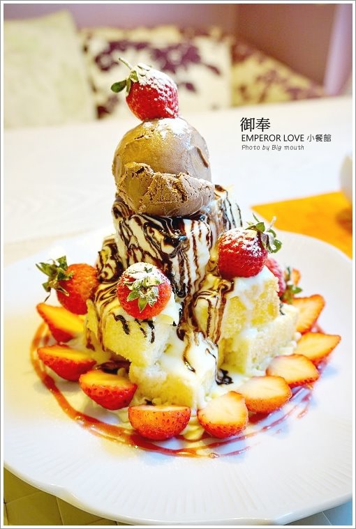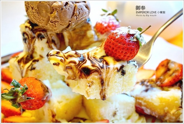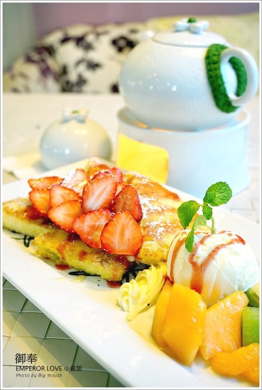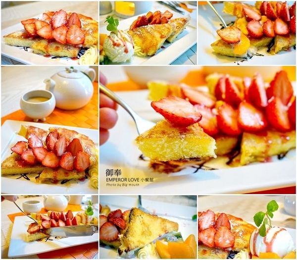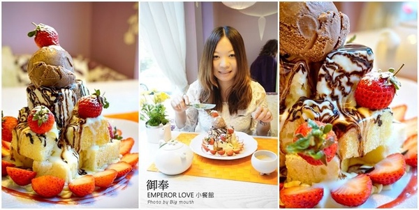 話 說大口來過台北市忠孝東路四段216巷這麼多次,竟然沒有發現這麼有一間用小時候大餅取代麵包、極富特色的創意小店!「EMPEROR LOVE御奉小餐館」白綠相間的外表頗為歐式,但卻有一扇古色古香的古典木門,走進一看,就像來到一個中西融合的小時代,空氣中瀰漫著淡雅茶香,讓你同時 擁有視覺、嗅覺與味覺的新享受!現在正逢初春,也是草莓盛產的季節,御奉小餐館將傳統大餅做成法式大餅及金磚,結合草莓做出一道道華麗的限定甜點,值得一 嚐!接下來趕緊帶大家來去瞧瞧「EMPEROR LOVE御奉小餐館」哪些創意美味吧!