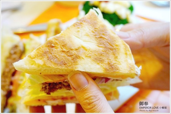 ▼裡頭份量不少的義大利肉醬與超級會牽絲的起司吃起來讓人為之銷魂啊!橘紅的醬汁被微微潤澤的大餅完整吸附,入口軟綿中帶點Q勁,搭配淡淡的餅香,只能說這份創意料理真的非常合我們的胃口!
