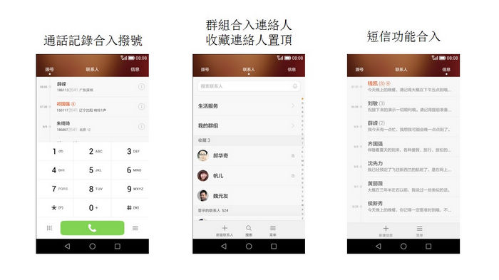 通話記錄與撥號鍵盤合在一起、群組內有最愛聯絡人顯示及訊息功能合入撥號記錄等,能與親友保持密切的聯繫與效率。