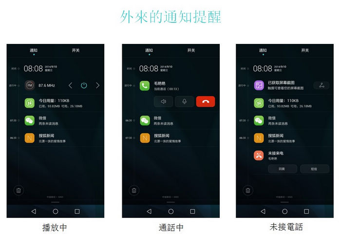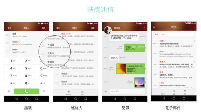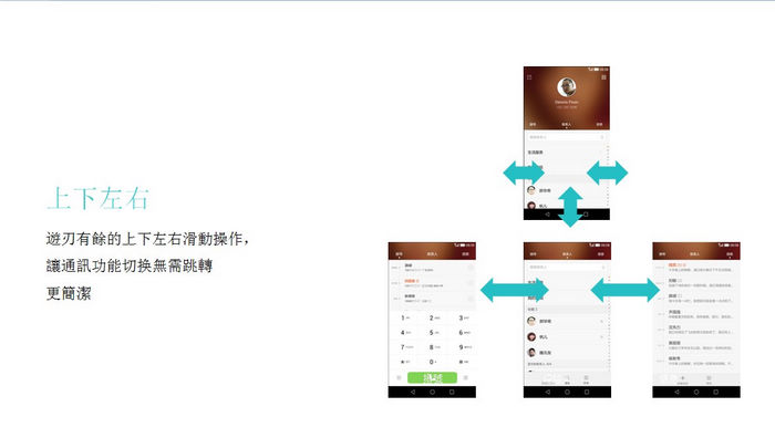 EMUI 3.0 以上、下、左、右及前後的方向變化營造順手的使用空間,將撥號畫面、聯絡人及訊息,整合至同一區塊,用戶以左右滑動即能切換,不需反覆跳轉切及按,也精簡可能不常使用的TAB頁面。