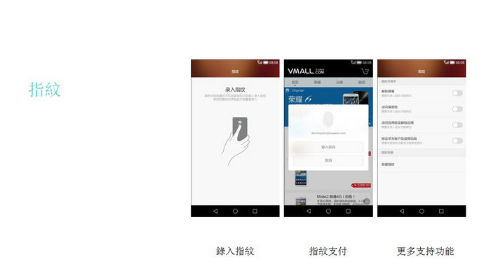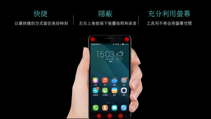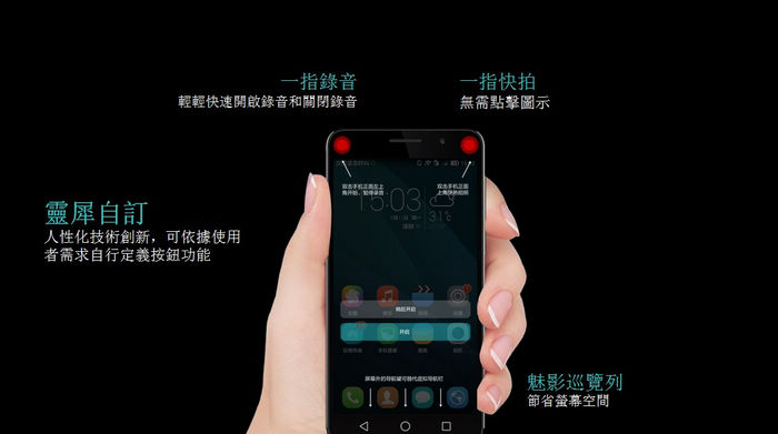 靈犀一指保護貼目前只支援榮耀6,貼上保護貼後,觸碰手機左右上方可用於錄音及快拍,且將螢幕下方的海苔條功能列隱藏,將手機表面的功能鍵面積擴大。
