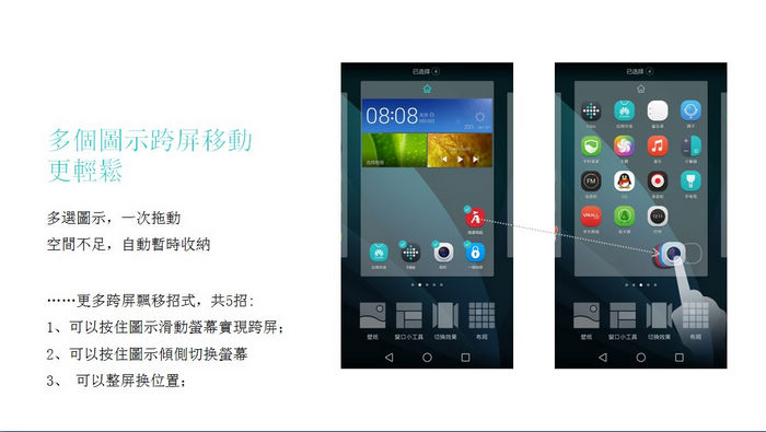 在使用電腦時常會一次選取多檔案,EMUI 3.0也能辦到,能一次移動多個App到其他桌布或快速切換桌布,