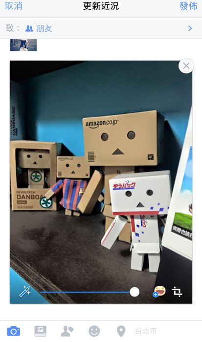 仔細一看,原來當我們要上傳照片時,可以看到下方多了三個小選項,由左到右分別是加強、貼圖和剪裁。