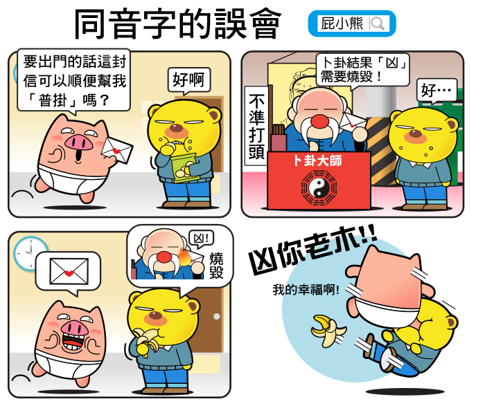 屁小熊 2015/03/11瀏覽: views 中文字真的很妙呀~同音但不同義的字在生活上還真是多呀~有時就是會這麼不小心就會錯意了~~~ 不知大家還遇過哪些同音不同意的字呢?歡迎分享! 同場加映「感冒乾咳喝這一道就對了!冰糖燉水「ㄌㄧˊ」」 老闆今天天氣好「陰涼」喔~可以早點下班嗎? 你剛是對我爆粗口嗎?給我留下來加班先 由屁小熊的小冊日記貼文。 由屁小熊的小冊日記貼文。 Related Items同音不同義屁熊內褲豬職場搞笑漫畫 好有趣 2015/03/11瀏覽: views 屁小熊 愛分享上班搞笑的屁熊還有內褲豬,職場不開心的話就快來找我們 ■作者:屁小熊 ■主題:職場、漫畫、生活、搞笑 ■個人網站:https://padbear68ee07.blogspot.com/ ■FB粉絲團:https://www.facebook.com/ppbear123 ■連絡方式:197968ee07@gmail.com Related Items同音不同義屁熊內褲豬職場搞笑漫畫 next page