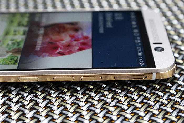 右側是microSD卡插槽,最大可擴充至 128GB 記憶體容量。microSD卡插槽下方是兩顆音量鍵,音量鍵下是機頂移至此的音量鍵,在鍵鈕上特別設際同心圓的紋路外觀,不容易誤按。儲存空間內建 3GB RAM / 32GB ROM ,高於 M8的 2 GB RAM / 16 GB ROM 儲存空間,最大支援記憶體達2TB。