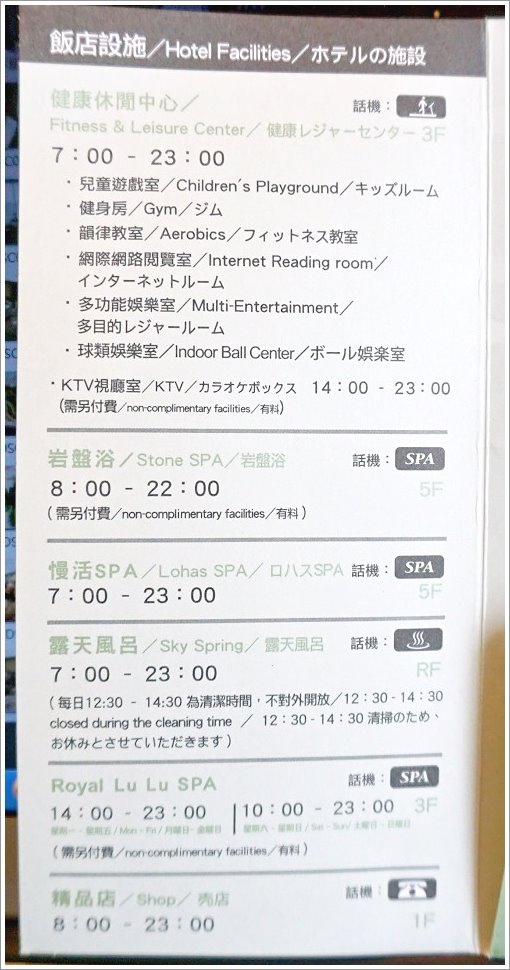 ▼另外住客都會有一份簡介,簡單介紹酒店內可用的設施與開放時間,只是有些活動是需要另行計費的!