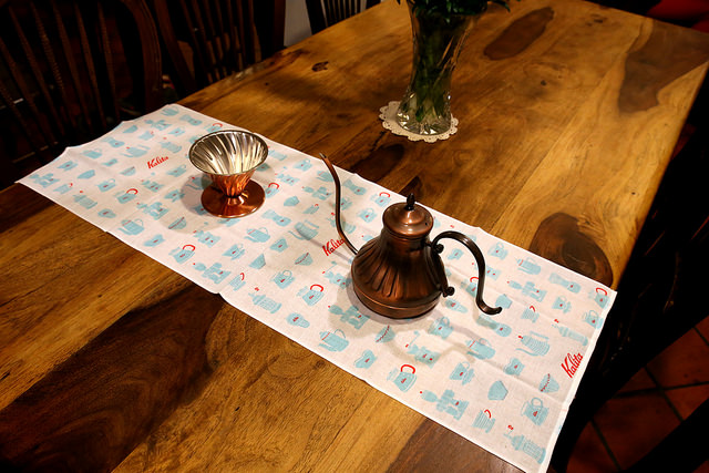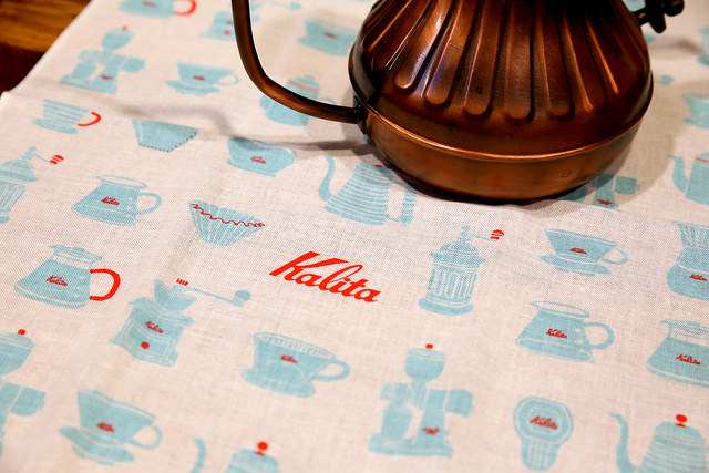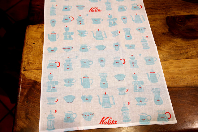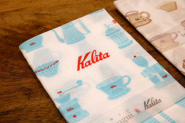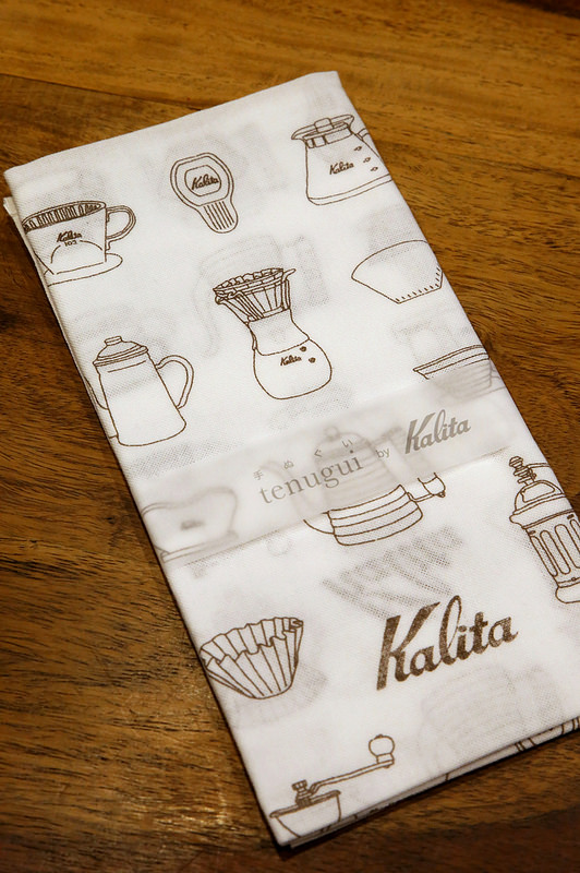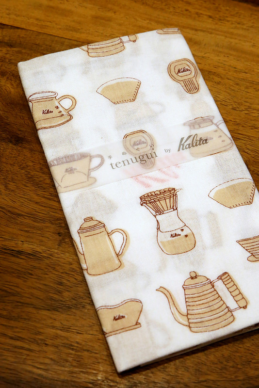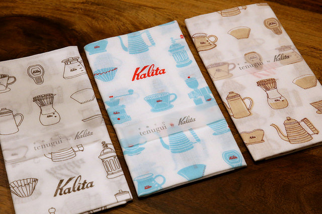 手拭(手ぬぐい)是日本傳統織物之一,可以用來擦拭手臉,或是圍在脖間、額頭等處,用途廣泛的融入在一般民眾的生活。但受限於材質較毛巾粗糙,逐漸不被消費者喜愛,現今多作為觀光名勝紀念伴手禮。這款由 Kalita 所販售的手拭,共有三個顏色,上面印有各種咖啡器具圖案,百分百純棉製造,長度為 90cmX35cm。