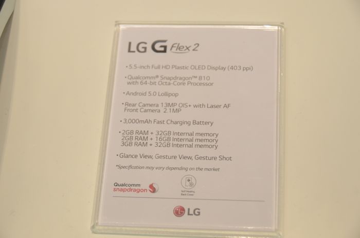 首先來快速復習一下 G Flex 2 的規格,Qualcomm Snapdragon 810 2.0GHz 處理器,5.5 吋 Full HD 螢幕、2GB、3GB RAM/16GB、32GB ROM、1300 萬畫素相機/ 210 萬畫素前置鏡頭與支援快速充電的 3000 mAh 電池容量。