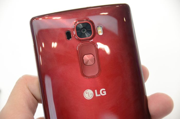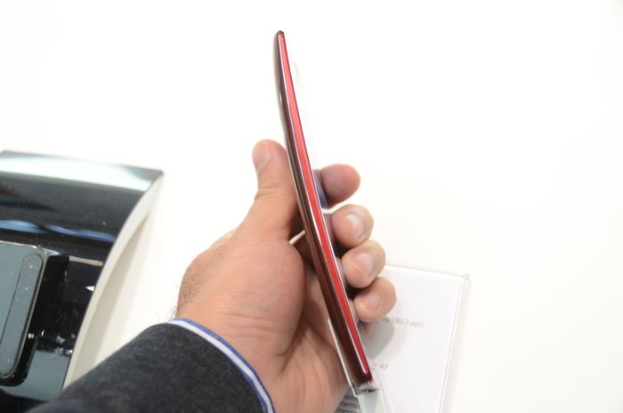 而在現場看到實機可以發現紅色 G Flex 2 依舊保持著珠光的清透質感,背面有著相機鏡頭與 rear key。