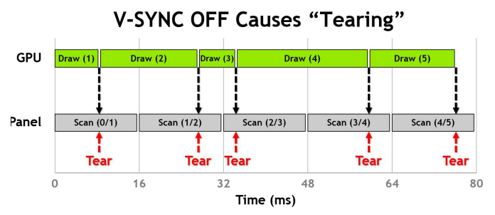 以螢幕的顯示方式,會快速地以掃描方式來呈現畫面,所以在完全沒有處理的狀況下,在畫面與畫面轉換的時候,就容易產生撕裂的狀況,尤其是電競遊戲的快速動作或是快速場景變化下,更容易出現這樣的狀況。以下面圖表來看,當GPU將圖片輸出時,若沒有配合螢幕更新頻率,就會出現畫面撕裂。