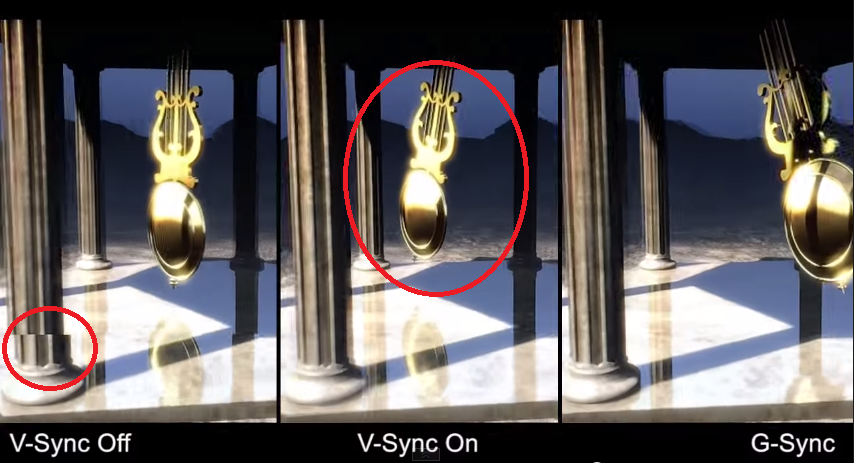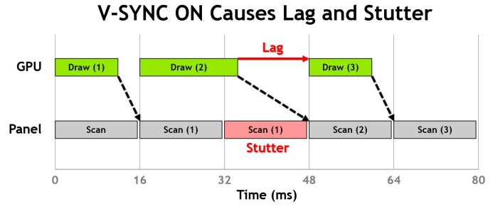 所以在遊戲時,有些玩家會選擇開啟垂直同步(V-SYNC),這原理就是讓顯示卡配合顯示器的掃描速度,來更新輸出畫面。當遊戲為了讓動作更精彩,有不少場景在單位時間內會提供更多畫面來讓動作更精彩,若需配合顯示器的掃描速度,畫面就會有延遲的現象,讓使用者也不會有太好的感受。就像下圖所示,要讓圖片輸出配合螢幕更新率,就會出現下一張畫面可能會比較晚出現的現象,而造成影像的延遲感。