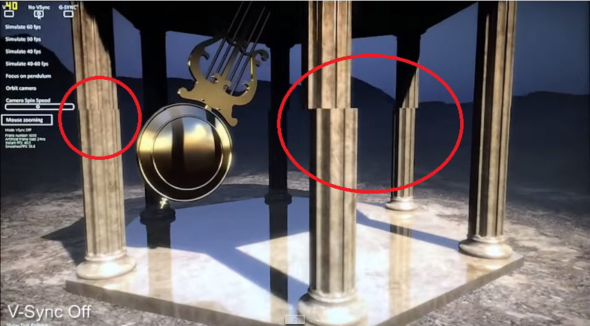 以NVIDIA所提供的測試範例來看,關閉V-SYNC時,會造成嚴重的撕裂現象;但如果將V-SYNC開啟,畫面又會有延遲的現象;這些問題都可以在G-SYNC上得到很好的解決,讓遊戲部會延遲也不會撕裂。