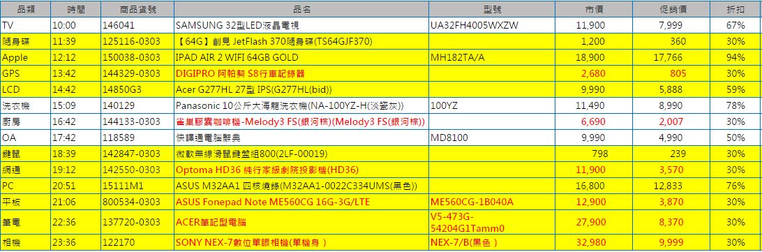大家一定很好奇有多便宜,請見下表,許多產品竟然三折買了!那麼高達280種商品該如何搶呢?建議先快速瀏覽商品品項,你缺3C產品還是家電,先一次選好,並把每項的特價時間記錄下來,若要搶的東西較多,也可以設鬧鐘提醒。