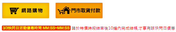 活動辦法:自3月3日 10:00開始快3網站每3分鐘會出現一檔特價品,期限3分鐘,選定後於10分鐘內完成結帳,超過10分鐘恢復原價。