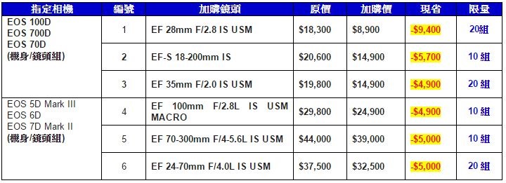 為鼓勵消費者趁著假期多走向戶外,拿起Canon相機拍照,留下感動瞬間,於展場中購買Canon 最新上市功能全面革新的數位迷你單眼EOS M3,現場即加贈300元7-11禮券;輕巧全幅單眼EOS 6D與進階玩家首選全幅數位單眼EOS 5D Mark III,審核通過後加贈EF 50mm f/1.8 II 定焦鏡頭乙顆,購買專業級類單眼PowerShot G7 X即送32G記憶卡與1,000元郵政禮券。消費者於春電展期間在Canon攤位購買指定數位單眼相機(如下表)除原本優惠外,現場還能以優惠價格加購指定鏡頭,最高可省9,400元(限定數量如下表),希望透過更優惠的價格提供優質的產品,持續攻佔市場買氣!
