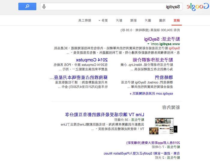 只要反著輸入 https://com.google/ ,便能看見平時熟悉的 Google 引擎竟然反過來的出現在眼前,這時輸入想要搜尋的關鍵字,竟然也是反著顯示在輸入列中。沒想到按下搜尋後,就連結果也是反向的呈現。不過還好點下後出現的網頁都是正常版,不然 Google 也實在太辛苦囉!!!
