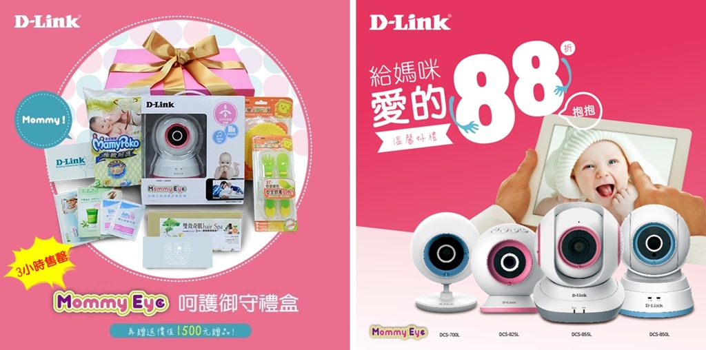 D-Link友訊科技台灣分公司總經理鍾振遠表示:「『媽媽』是全世界是最難勝任的職位,尤以新手媽媽為最。此款業界首創的超值『媽咪愛御守禮盒組』,正是D-Link與所有合作廠商為母親獻上的真摯祝福,禮盒中之寶寶專用攝影機與各式母嬰用品,讓新手媽媽不再手忙腳亂;也能在媽媽給寶寶無微不至照顧的同時,照顧媽媽們的身心需求。此外,D-Link為了感謝消費者的熱烈迴響,於母親節前更加碼推出「給媽咪愛的88(抱抱)」優惠活動,即日起至4月底止,凡於各大經銷門市或線上平台皆可享有MommyEye系列攝影機最低88折之專屬優惠,機會難得,要買要快!」