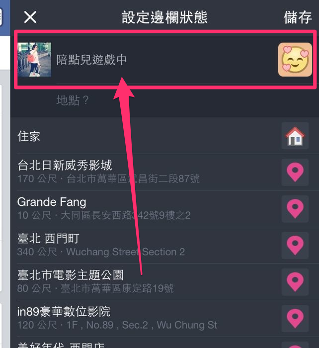 更新狀態區中,不僅能夠使用文字輸入,一旁還有提供許多符號來讓文字狀態更加生動。下方也會透過地標讓我們可以輸入想要打卡位置。