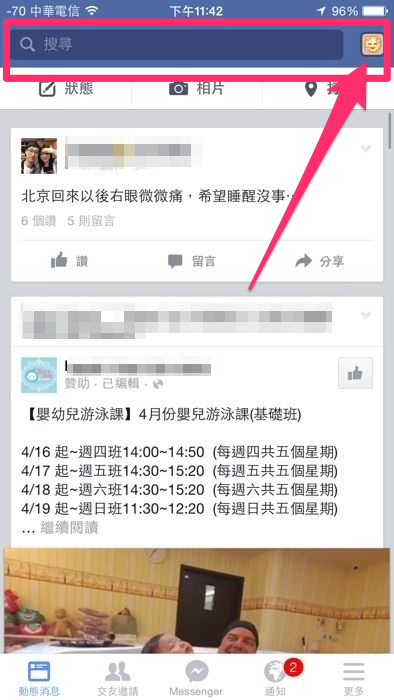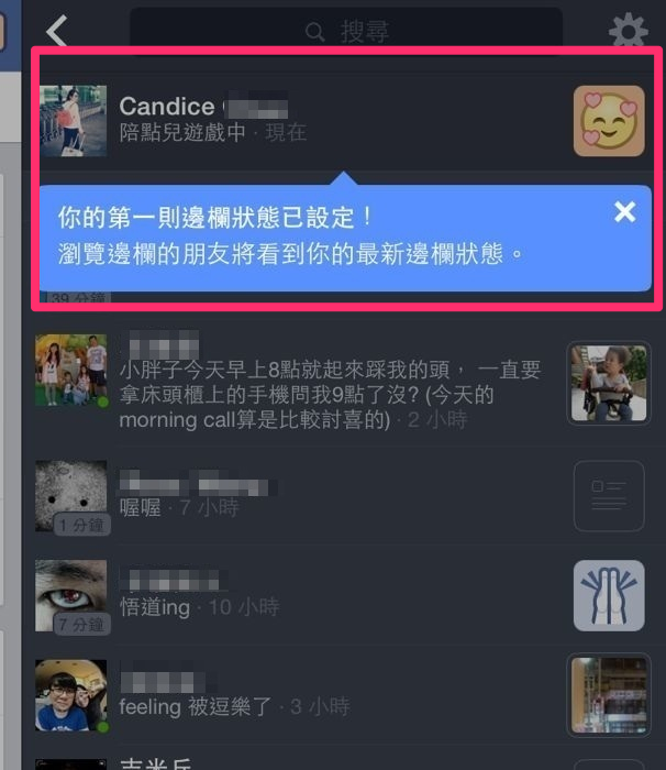 當輸入完成也就是設定完成,這時你的邊欄狀態並不會出現在塗鴉牆上,而是朋友們點進這邊欄區後可以看見你的狀態。