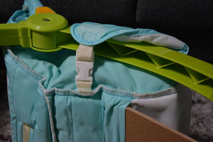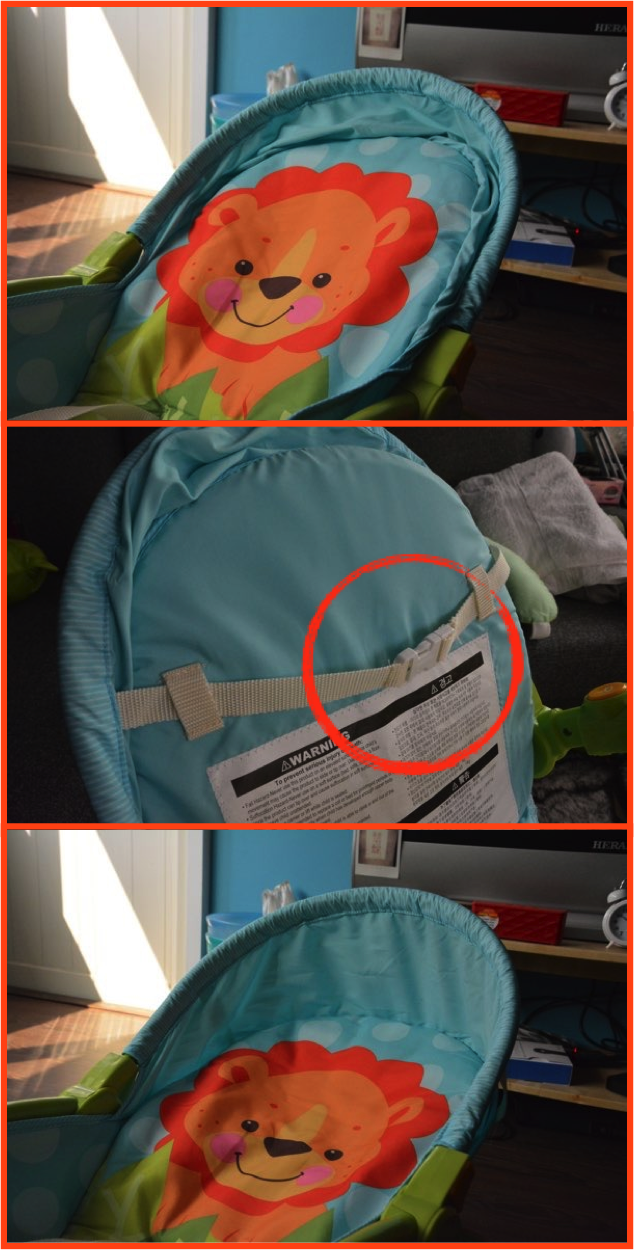 而安撫椅還有設計兩種高度,只要透過椅背後方的扣環就能調整。這樣當寶寶剛吃飽或是跟他遊戲的時候,就能高高的坐在上方,等到他想睡了,再輕輕地解開扣環讓他平躺著好好休息。