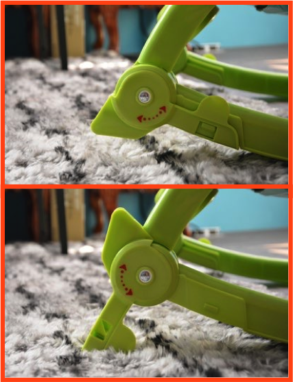 腳座旁邊還可以看到紅箭頭的地方,那是用圖示的方式教我們要怎麼調整,所以只要將支撐架拉開,原本是搖搖椅的功能就馬上變成椅子固定住,讓寶寶安穩的在位置上,專心看著這美麗的新世界。