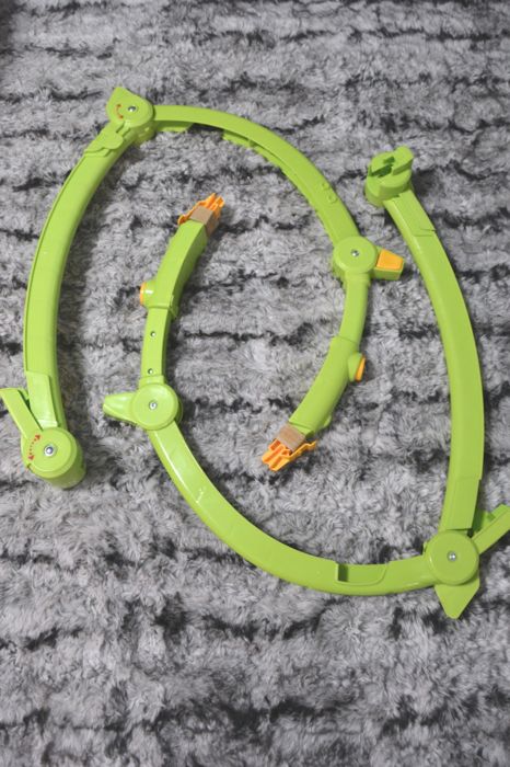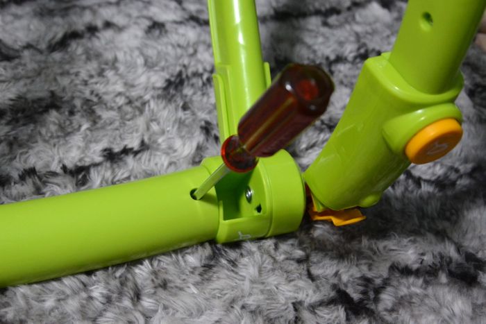 首先將最主要的腳座安裝起來後,將橫桿和腳座合上,再拿出盒中兩顆螺絲把兩邊鎖緊,就可以把橘色的固定卡榫安裝上去了,廠商很貼心的設計只要打開扣上去,聽到喀一聲,就可以完全扣上了,但要注意這有分左右喔,先放好左右之後下一步安裝就比較方便了喔!