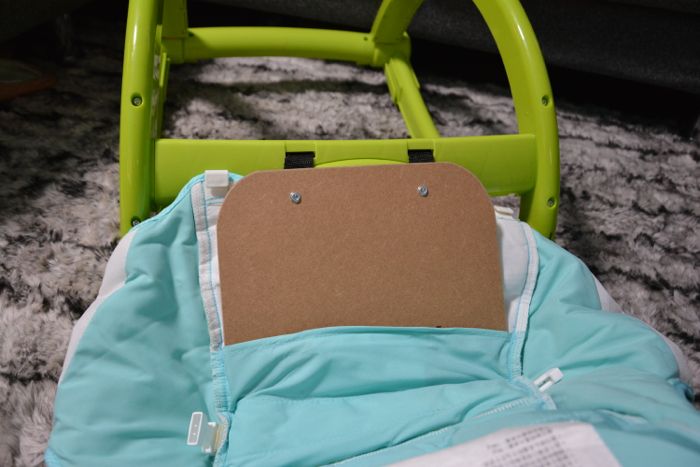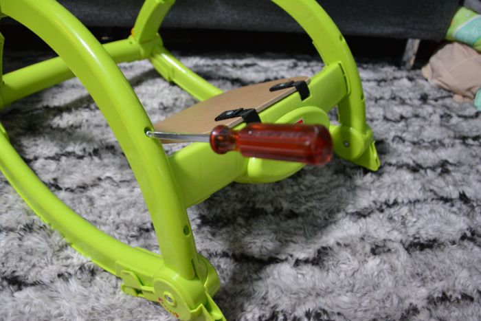 再將有開關和厚紙板的這個配件安裝到另一面,把這個配件合上另一面後,會有四個螺絲要準備安裝上去,安裝完後主體大致都已經完成了,在這麻煩安裝的爸爸媽媽要把螺絲鎖緊喔,不然會椅子鬆鬆地搖晃,不管是對孩子的舒適度或椅子的耐用度都會有影響。