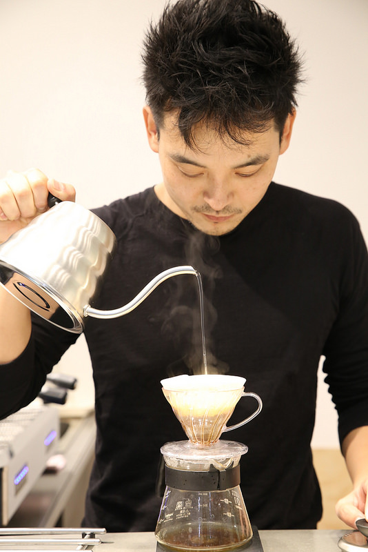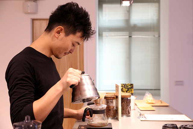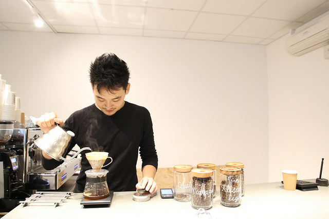 乾淨俐落的室內裝潢,說不上是北歐極簡或日式和風,但我相信成本絕對是優先考量。但是以實用性與可看度來說,大叔給他一百分!首先,把義式咖啡機放在側邊,沖煮咖啡時不會背對客人,或是被咖啡機給擋住。而手沖工作區則是正對著來客,而吧檯的高度,讓手沖壺與咖啡師的手、臉距離拉近,拍照起來非常有張力。同時上方的六盞LED燈光照明,亮度足夠又不會太熱。