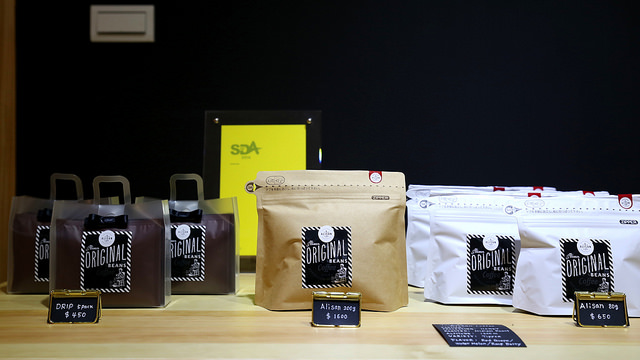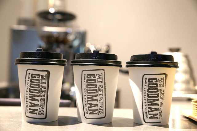 沒錢有沒錢的做法,千萬不要讓資金限制住妳的品味或是想像力!像是在 GOODMAN ROASTER 的這個紙杯,上面的圖案字體,是用印章一個一個印上去的,伊藤先生說,因為紙杯是圓弧表面,所以印的時候還要轉一下才行。