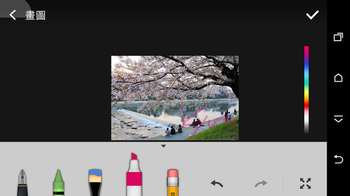 同在創意編修中的”畫圖”,能選擇各式筆觸在照片上寫字。