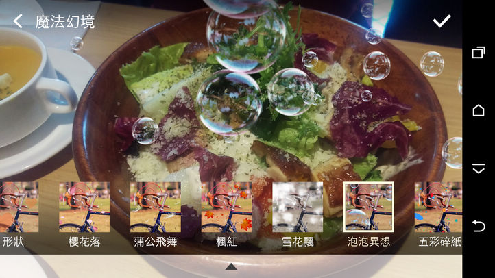 魔法幻鏡是在照片上搭配不同的動態情境,讓照片呈現如動畫般的奇幻夢幻感,其中又以”泡泡異想”的效果最為自然,浮出的泡泡自然融入照片影像而非外力效果。