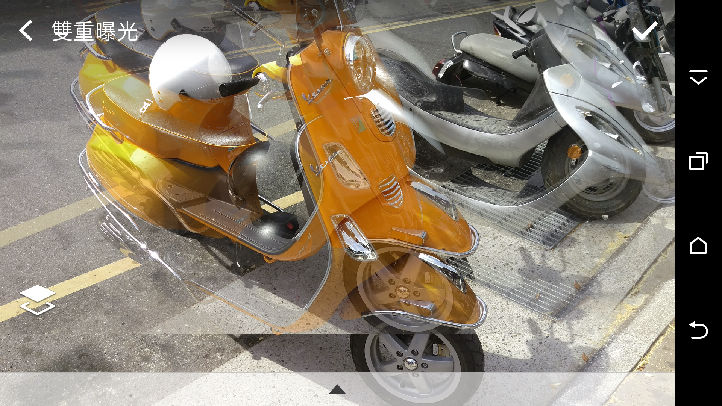 雙重曝光可合併並融合兩張相片,創造出寫實的效果,用戶能編輯前景及背景,並分別決定這些前景、背景的亮度、對比、色溫、飽合度。