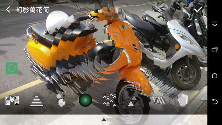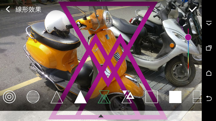 特效中的線形效果、簍空特效、幻影萬花筒這三種選項有點類似,是在照片上做出幾何圖形的效果,可將幾何圖形簍空、上色,或使用其他的照片融入各式的幾盒圖形樣式疊在照片上。