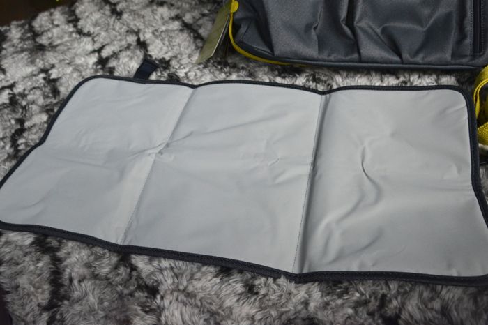 防水尿布墊是我個人覺得這個媽媽包最棒的設計之一。因為寶寶隨時有可能需要在外面換尿布,不管是朋友家中或是景點的親子廁所,講實話做媽媽的或多或少都不願意也不放心讓寶寶柔嫩的屁股直接放在那公用的尿布台上,而這自己帶的防水尿布墊剛好可以解決這種心頭的不舒服感覺,放心的在外面幫寶寶換尿布。