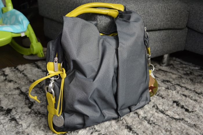 這次收到朋友送的這款德國品牌 lassig 丹寧托特媽媽包在外形上有著不呆板不老套的弧線皺折設計,配色更是採用年輕的牛仔藍與亮黃色來搭配,包包右下方還用縫線縫出了招牌狗狗 logo 呈現出年輕活力感,讓不管裡面裝了多少奶瓶、尿布,自己身上還有多少脂肪,至少揹著的時候不會看起來很笨重。