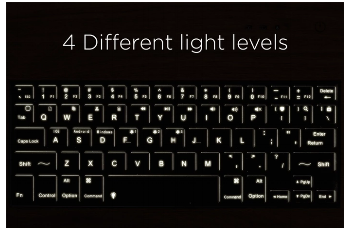 當使用者在黑暗的房間或是在飛機上這些光線不足的地方,也不用擔心!因為這台鍵盤也有背光功能!而且有四種不同的燈光亮度,讓使用者在不同的光照條件下工作,也不會影響到別人。