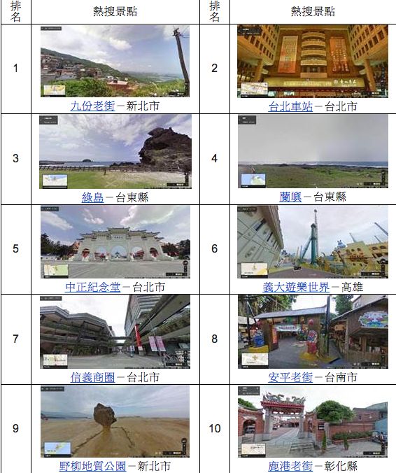 更值得注意的是,在 2013 年首度上線的綠島及蘭嶼等離島地區,以及擁有獨特地質環境的野柳地質公園,是本次 Google「最新街景熱搜景點排行榜」的最新亮點,透過 Google 街景背包可深入巷弄小徑、崎嶇地形的特性,Google 街景得以囊括這些以前無法到達捕捉畫面的地區,讓全球網友現在 Google 街景服務上都能看到這些景觀的美麗。