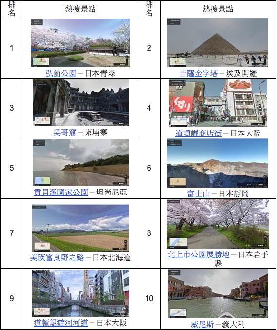 此外,從 Google「最新街景熱搜景點排行榜」中可也發現台灣網友對於古文明建築的搜尋量有顯著提高,像是神秘的埃及開羅吉薩金字塔,及以細緻浮雕聞名於世的柬埔寨吳哥窟,都是首次進入排行榜,便榮登第二、第三名。隨著 Google 街景不斷改善拍攝器材、突破拍攝技術限制,克服地點、地形及環境限制,許多以往被視為高難度的人文自然景觀,都一一拍攝完畢且上線,讓網友們現只需要上網便能透過 Google 街景服務輕鬆瀏覽各地景點,像是佔地廣大的坦尚尼亞貢貝溪國家公園,以及在獨木舟上完成拍攝的水都威尼斯,在上線便受到台灣網友的矚目。